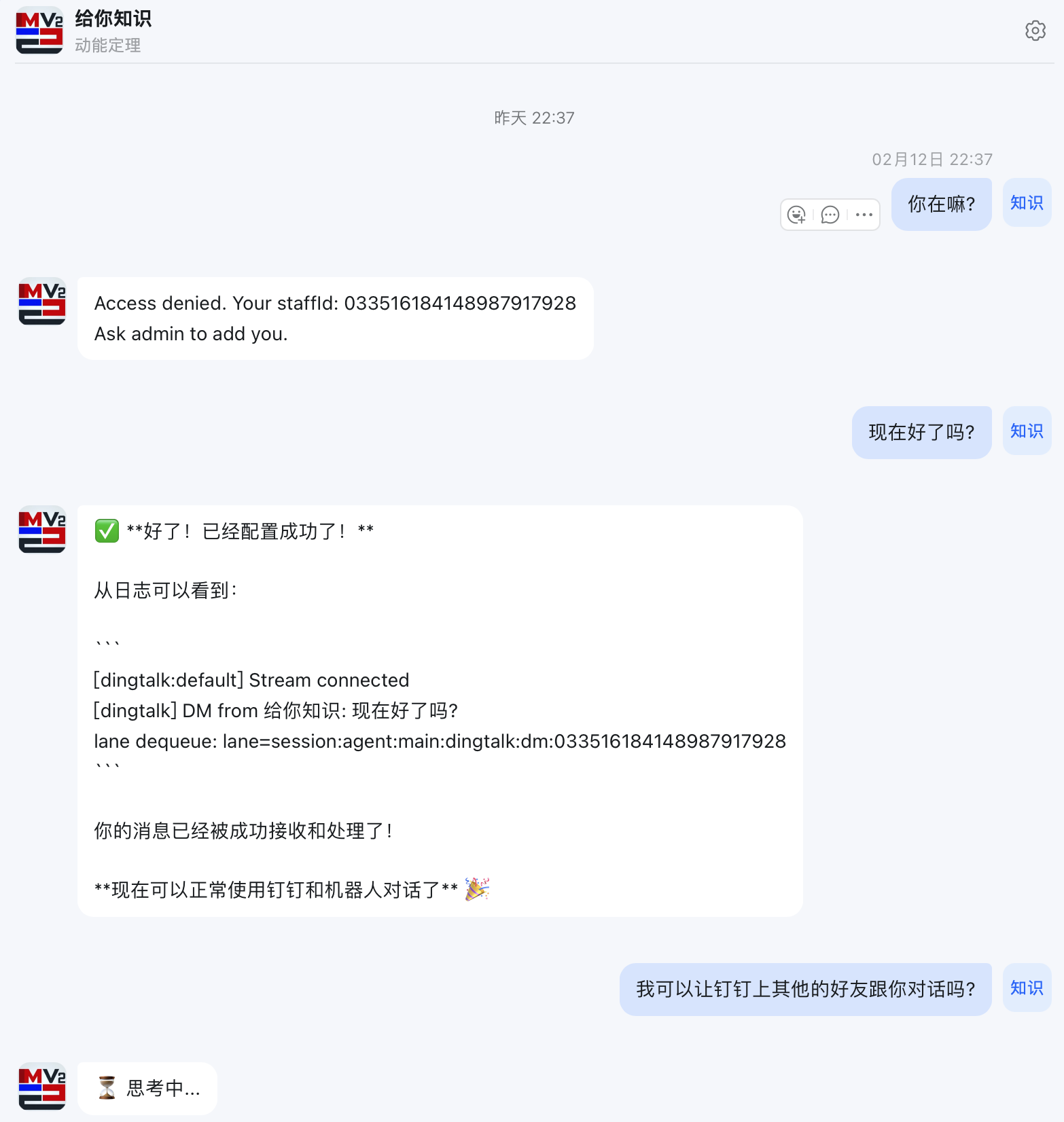 我跟着它的提示,用企业管理员账号登钉钉开放平台,创建企业内部应用,开通机器人能力、开启消息接收权限,拿到 AppID 和 App Secret 发给它,剩下的配置它自己就搞定了。一开始还遇到了权限问题,提示 Access denied,让openclaw自己搞定下权限就好了,日志里显示 Stream 连接成功,消息能接收处理,那一刻真的太开心了。