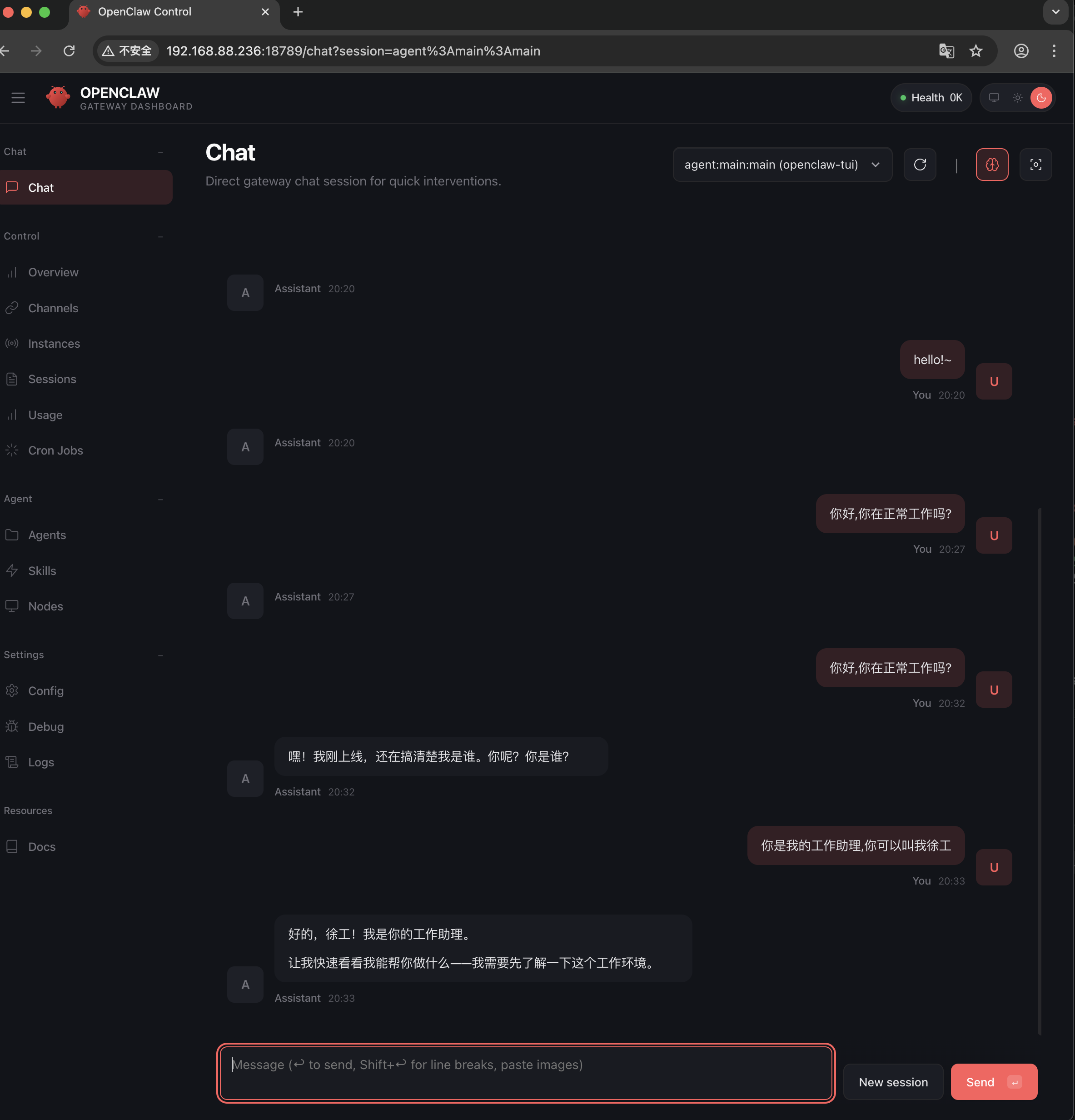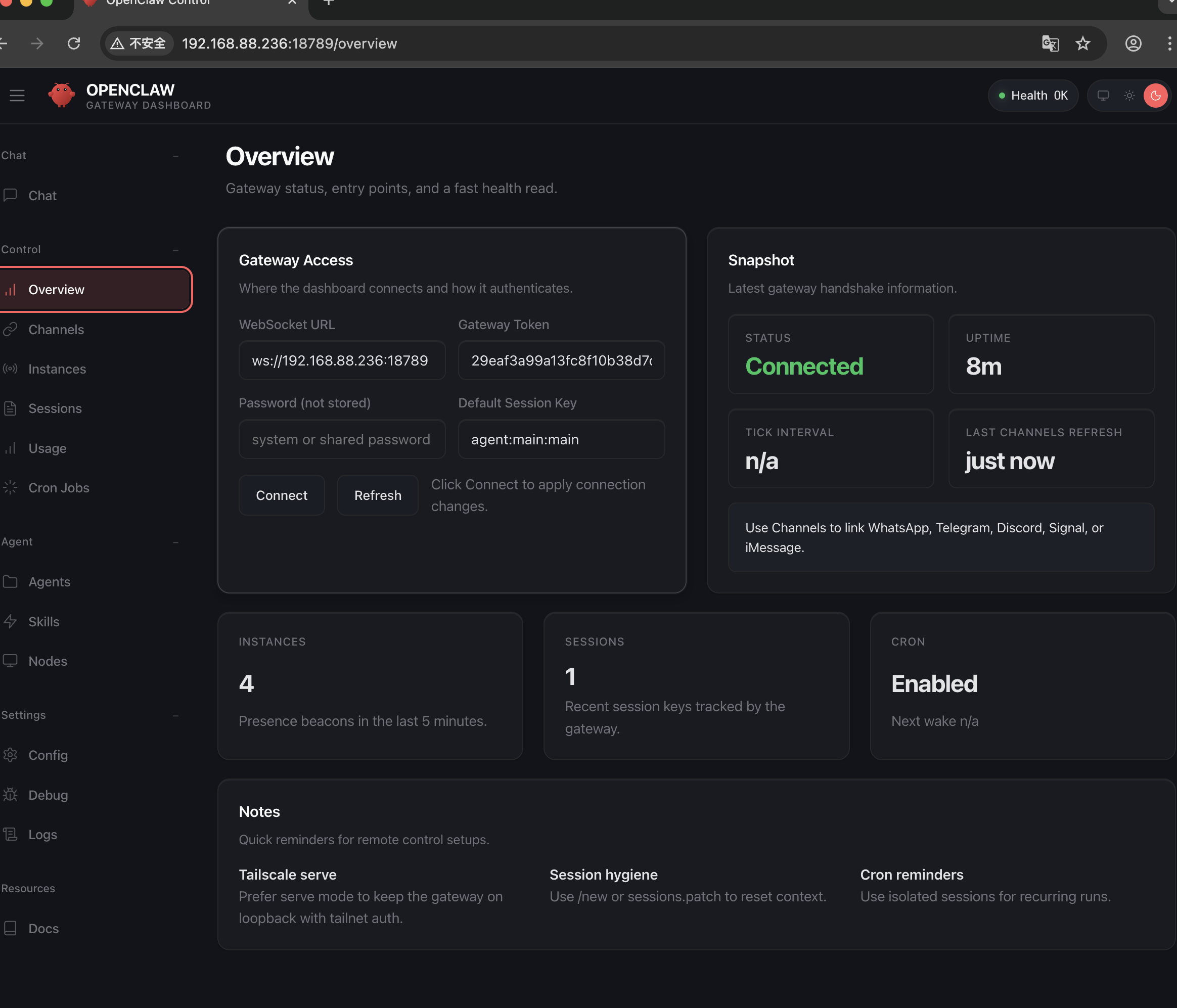 打开浏览器输入局域网 IP 加端口,进入 OpenClaw 的 Web UI,在 Overview 里填入配置文件里的网关TOKEN,点击连接,仪表盘就显示已连接了。本以为这下能聊天了,结果发消息完全没回应,才反应过来 —— 忘了给 OpenClaw 装 “脑子” 了!它只是个执行框架,得接入大模型才能有对话和思考能力。