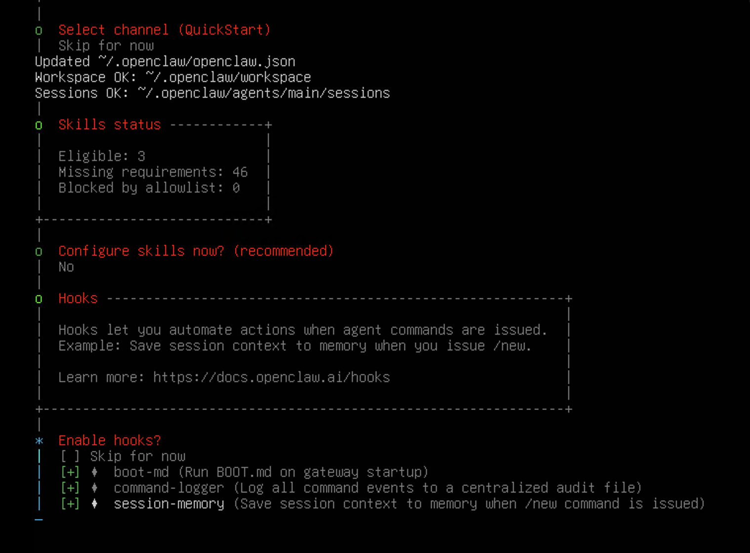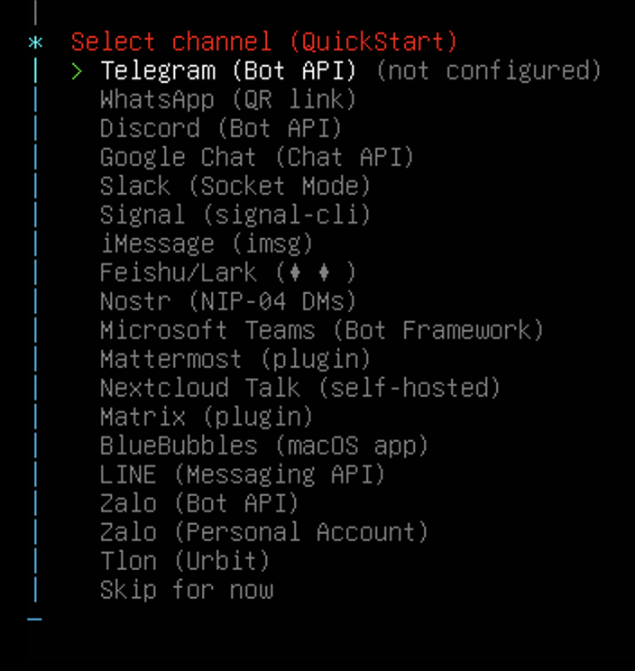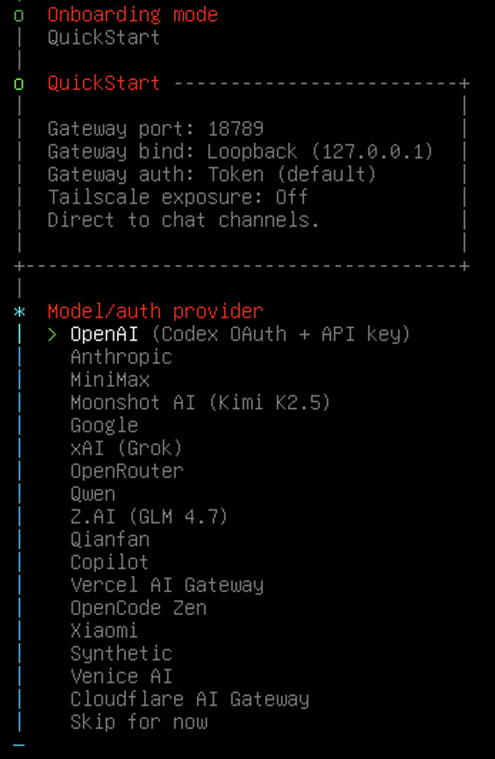 部署模式我选了快速启动,后续想精细配置还能再调;大模型提供商那边,国外的 OpenAI这些在国内连起来不稳,直接选了 minimax-cn,留着后续对接;渠道选择暂时跳过,因为我想接钉钉,这里没有内置选项,本来一开始想接微信的,可惜微信回调需要公网 IP,我没有,钉钉就方便多了,不用自己弄公网;技能配置也选了稍后再弄,先把核心的跑起来再说;最后启动方式选了 “Do this later”,实在是太想快点看到效果了,等不及慢慢配置 TUI 了。