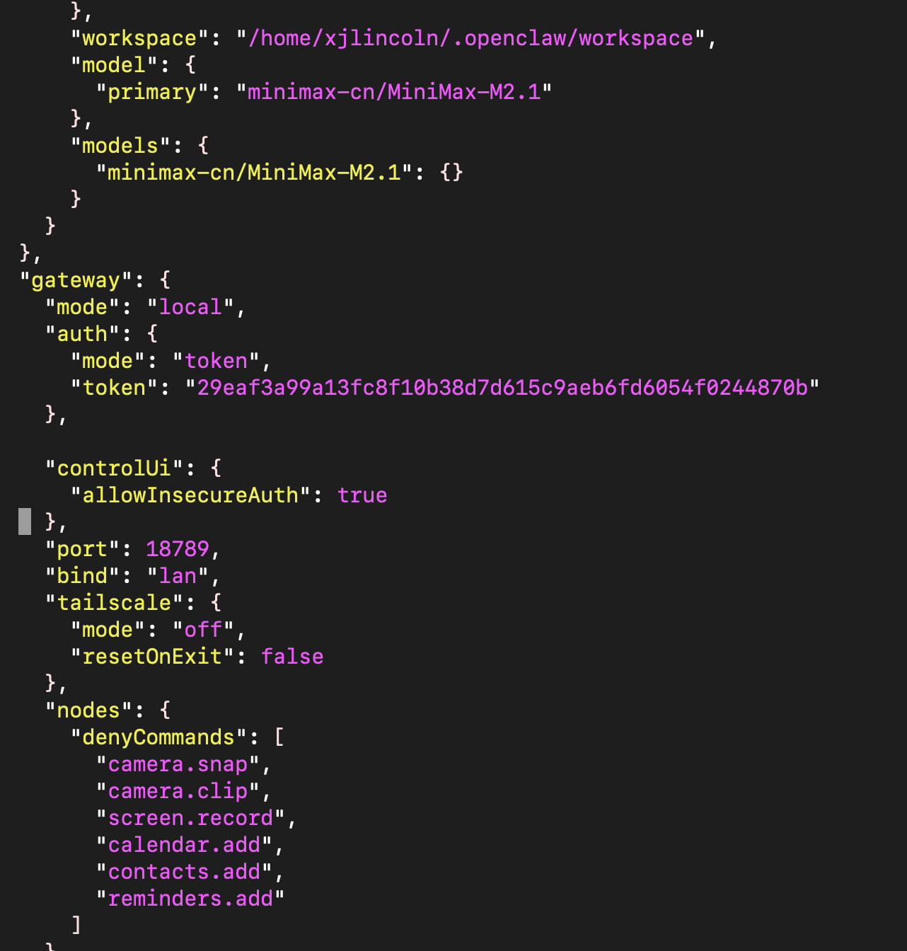 配置完默认是本地回环地址访问,只能本机用,肯定不方便,得改改配置文件。打开~/.openclaw/openclaw.json(TOKEN我就不打码了,反正也是玩玩,到时候直接删虚拟机),把 gateway 里的 bind 从 loopback 改成 lan,再加上 controlUi 配置允许不安全HTTP 访问,改完重启网关,用 status 命令查看,显示运行正常,局域网 IP 也能访问了,完美。