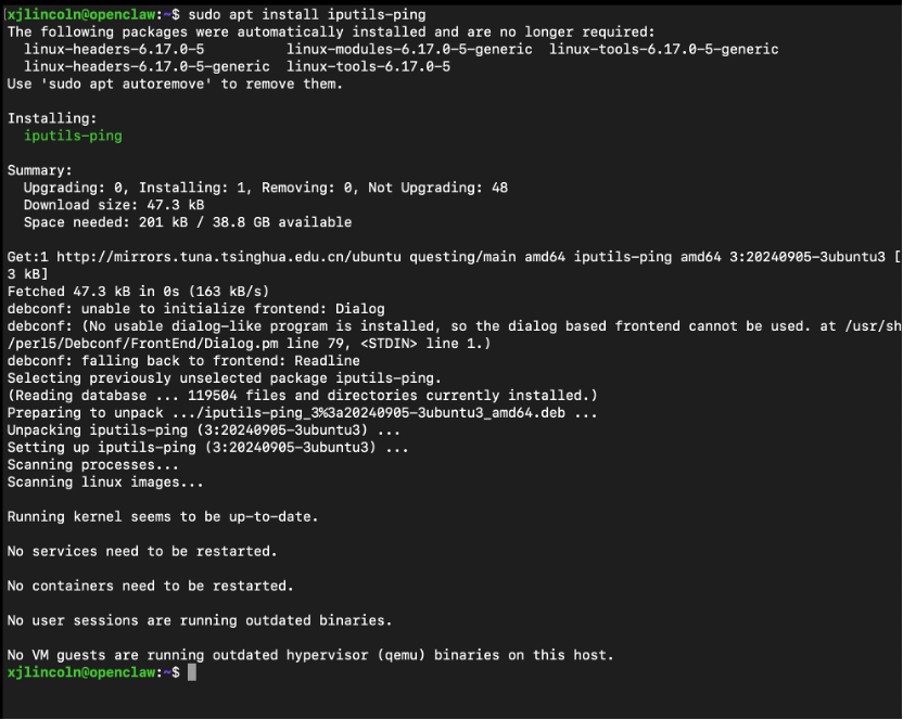 装完系统先查了下 IP,确认 ens33 网卡配置正常,本想 ping 下外网试试网络通不通,结果发现 Ubuntu 最小化安装居然没带 ping 工具,那就先装上,再把软件源更个新,为后续装 OpenClaw 做好准备。