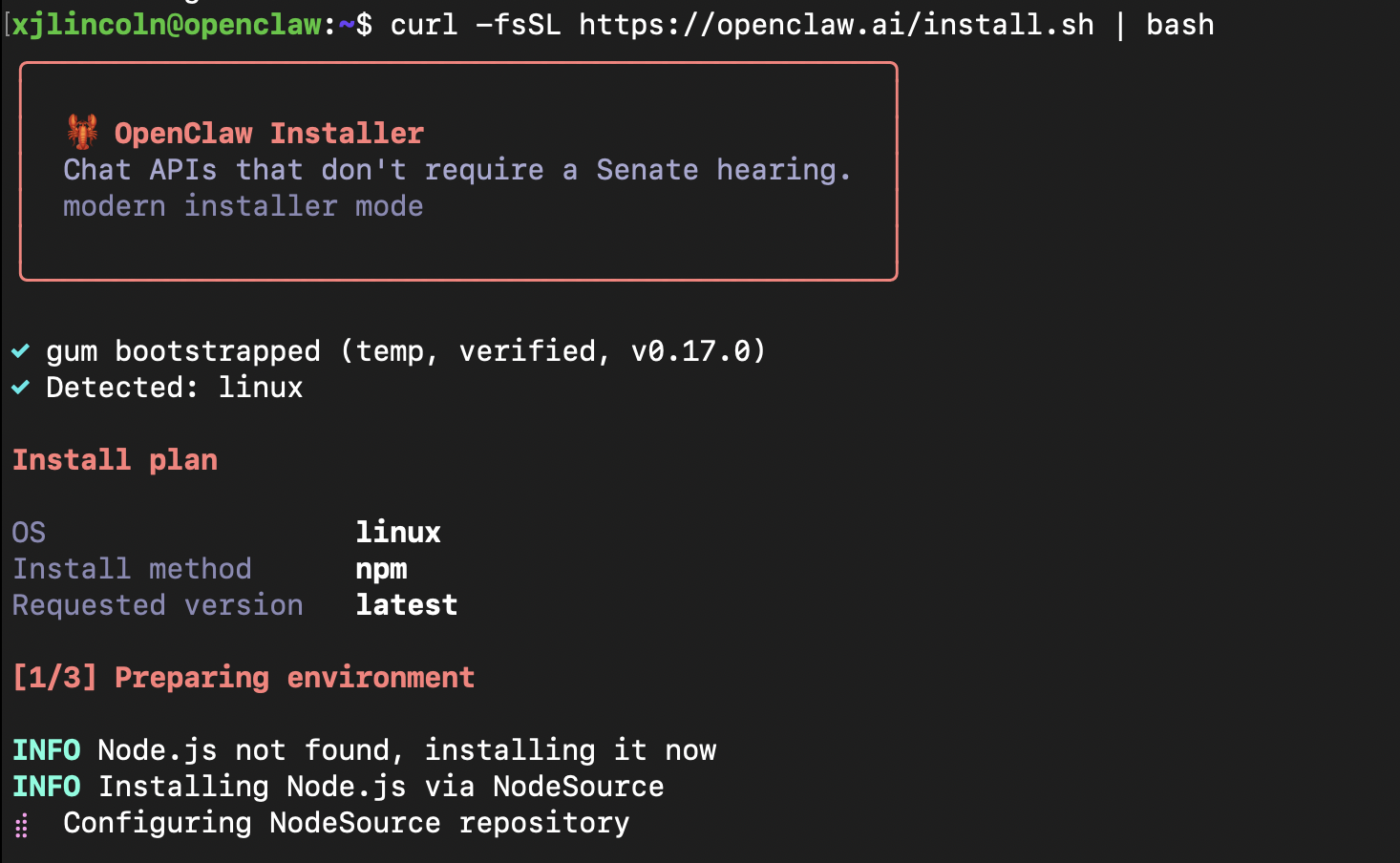 一切准备就绪,终于可以装 OpenClaw 了,执行官方的安装脚本就行,全程自动化检测环境、安装 Node.js,还挺省心。(不过提一嘴,国内网络没 “魔法” 的话,opencode.ai 是装不了的,curl 连 github 会超时。)