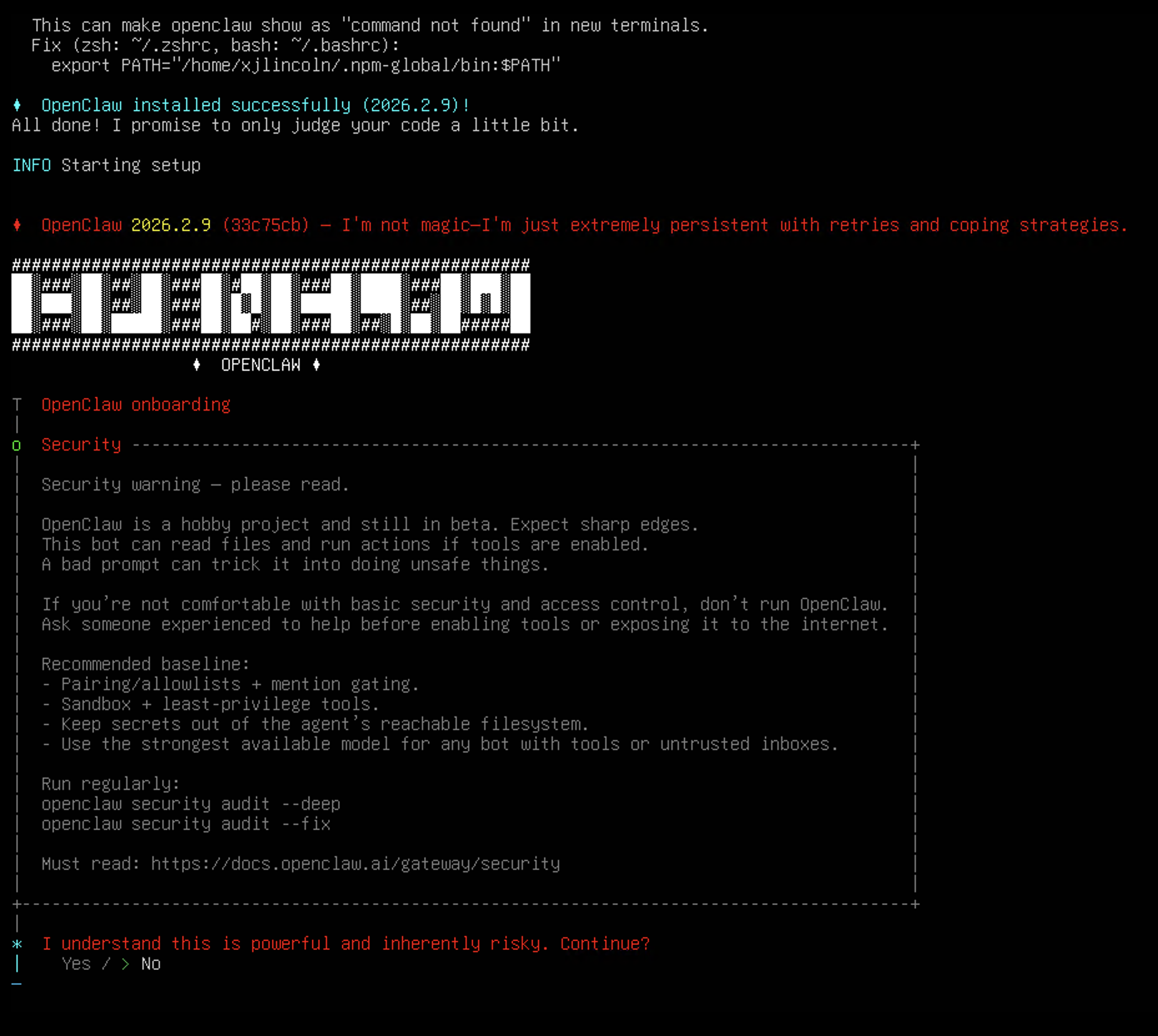 安装完成后自动进入配置界面,首先就是安全声明,提示 OpenClaw 还在 Beta 版,有文件读写、命令执行的权限,存在一定风险,既然是玩技术,这点风险自然是愿意承担的,输入 Yes 继续。