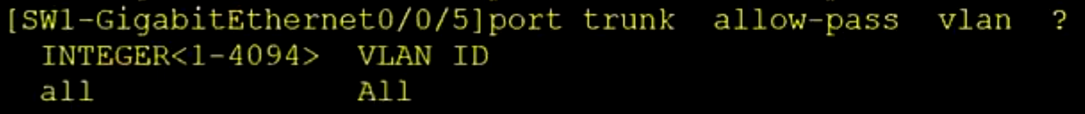 [sw1-GigabitEthernet0/0/5]port link-type trunk [sw1-GigabitEthernet0/0/5]port trunk allow-pass vlan 2 to 3