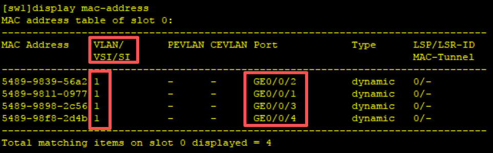 [sw1]display mac-address ---查询交换机MAC地址表