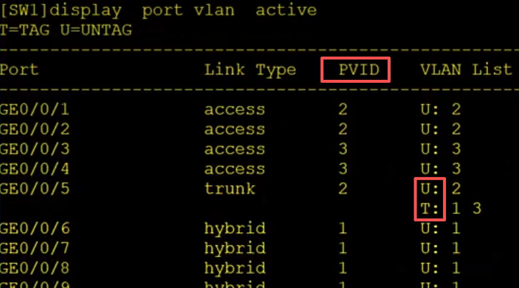当trunk接口发出数据帧时,会查看接口的允许列表,如果数字帧中携带的VID在允许列表中,则会转发这些数据帧,之后如果数据中的VID和接口的PVID一致(U)则剥离标签转发,如果不一致则保留标签(T)转发。