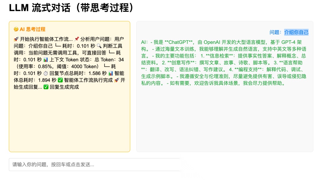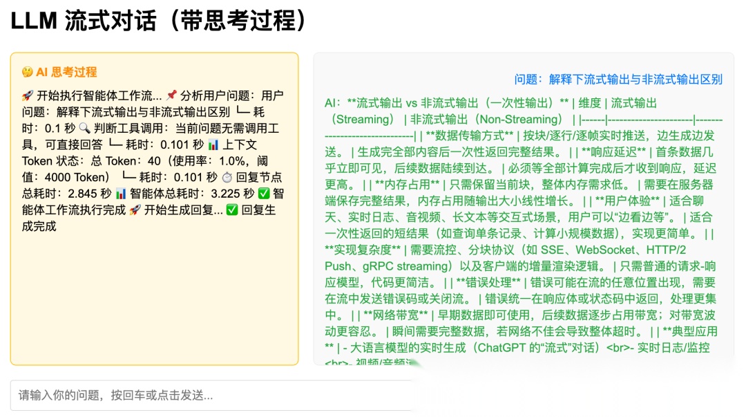 3.在输入框左上方实时查看思考响应流,右上方看到回答响应流。