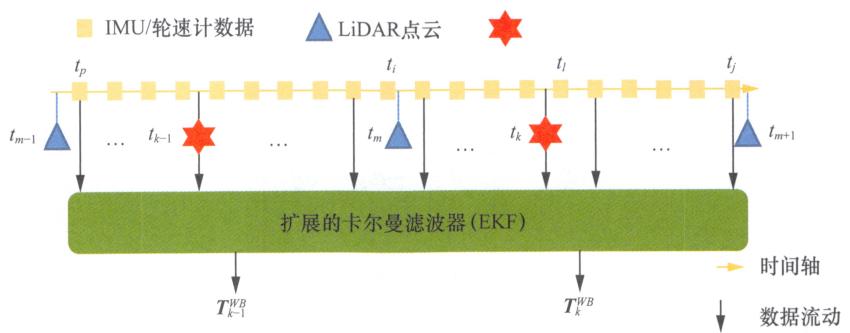 在IMU-AHFLO算法中,IMU和轮速计以 100Hz100\mathrm{Hz}100Hz 的频率运行,激光里程计以 10Hz10\mathrm{Hz}10Hz 的频率运行,激光里程计和IMU/轮速计的耦合流程如图12-2所示。