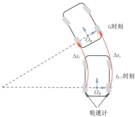图12-3给出了简化的车辆运动模型,IMU安装在车辆后轴中心,IMU坐标系的定义与车体坐标系的定义一致,两个轮速计分别安装在两个后轮处。小车由 tk−1t_{k - 1}tk−1 时刻位置行驶至 tkt_ktk 时刻位置,其间,左、右轮速计输出的行驶距离分别为 Δsl\Delta s_lΔsl 和 Δsr\Delta s_rΔsr ,IMU输出的三个轴向角速度信息为 BωkWB=[ωkx,ωky,ωkz]T{}_B\omega_k^{WB} = [\omega_k^x,\omega_k^y,\omega_k^z ]^{\mathrm{T}}BωkWB=[ωkx,ωky,ωkz]T , BωkWB{}_B\omega_k^{WB}BωkWB 是车体坐标系相对世界坐标系的旋转角速度在当前车体坐标系下的表示。H.Xue等人在IMU-AHFLO算法中利用IMU输出的角速度信息估计车辆的姿态,并结合轮速计数据估计车辆的位移。