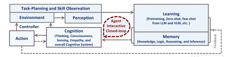 高层次架构如Figure 5所示,包括五个主要模块:1)环境与感知(任务规划和技能观察);2)代理学习;3)记忆;4)代理行动;5)认知。 这个设计提升了泛化深度、意识和复杂适应AI系统的可解释性。