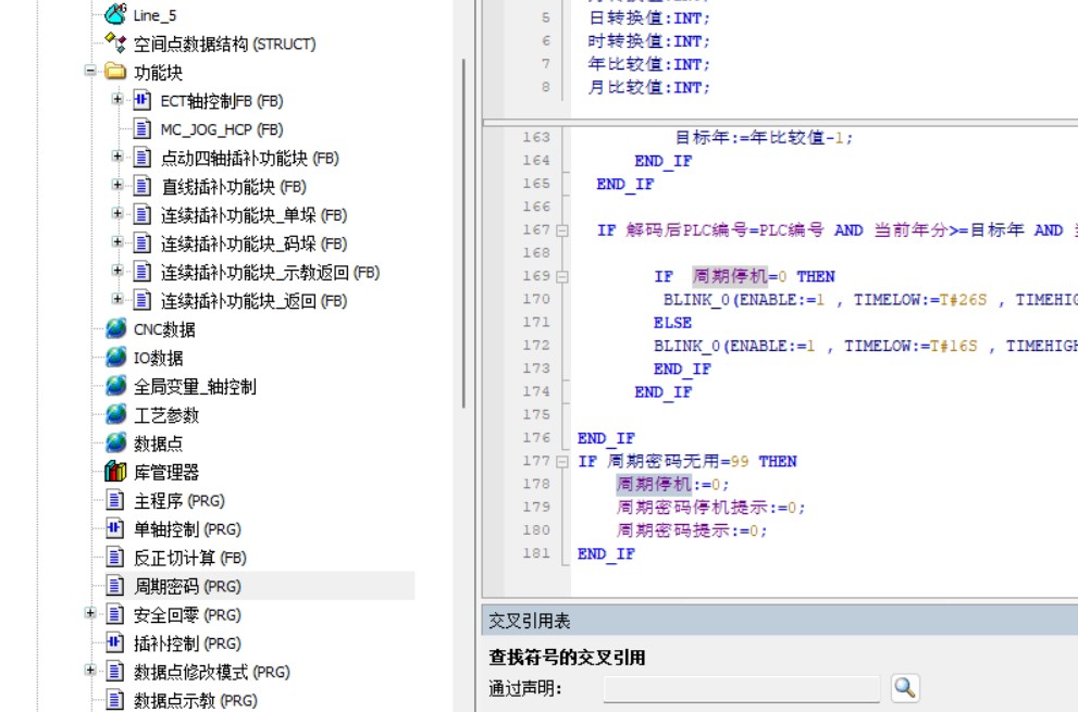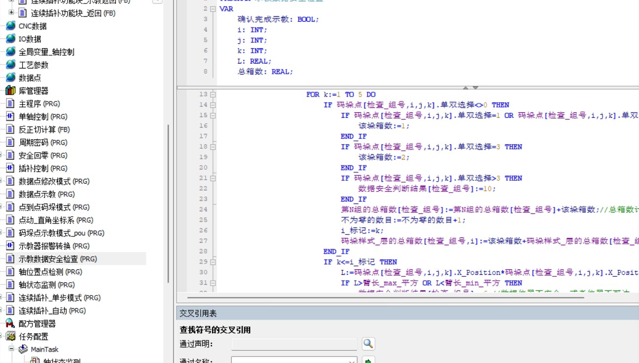 09、汇川码垛机械手,含程序、BOM表、电路图。 可编程控制器CPU模块 (汇川) AM401-CPU1608TP 示教器(汇川) ITP60-E-L5 主要功能: 1、有单垛和双垛,回字型,层数不受限制。 2、配方功能、周期密码(分期付款注册码) 3、插补控制(单步插补和自动连续插补,可暂停并记忆继续运行) 4、正反切计算 5、示教模式和参数模式兼容等等 6、触摸屏有140个页面(含弹出窗口) 主要元器件(详细见附件)见BOM表 汇川系统开发的陶瓷砖码垛机械手,详细动作可查看视频,动作和功能完全按照现在流行的机器人运行模式编写, 附件包含PLC程序和库文件,带详细注释(见截图); 附件包含触摸屏详细见截图; 附件包含电气图纸和电气元件清单; 附件包含详细操作说明书;已在陶瓷厂中使用近百台。 程序案例中涉及的编程软件版本分别如下: 触摸屏编程软件版本:InoTouchPad V1r2c00SPC33(2023-02-28)PLC 程序编程软件版本:InoProShop(V1.1.0)