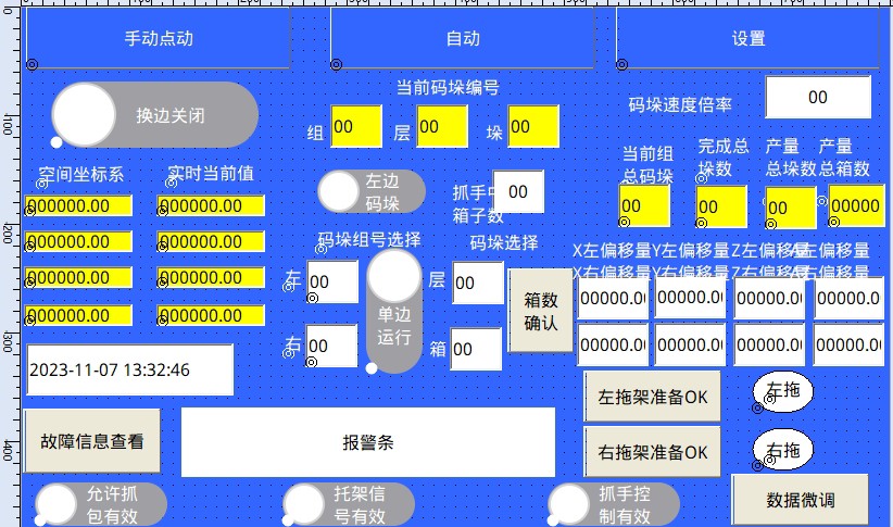 单步插补时系统每200ms刷新一次坐标,自动模式直接走S型速度曲线。现场实测双垛模式切换时,气缸夹爪和伺服轴的动作同步误差不超过0.5mm。