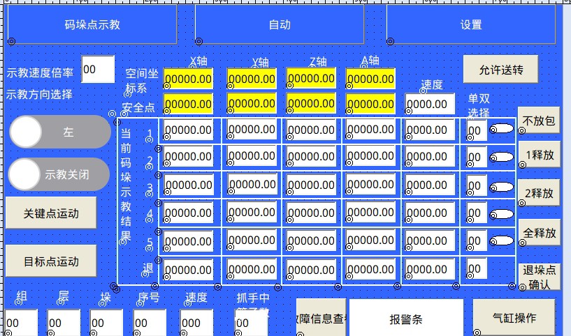 操作工常用的6个页面放在首页,维修模式要划三下屏幕再双击版本号才能进。特别是那个回字型垛型编辑器,直接能在屏幕上画田字格设定摆放顺序。