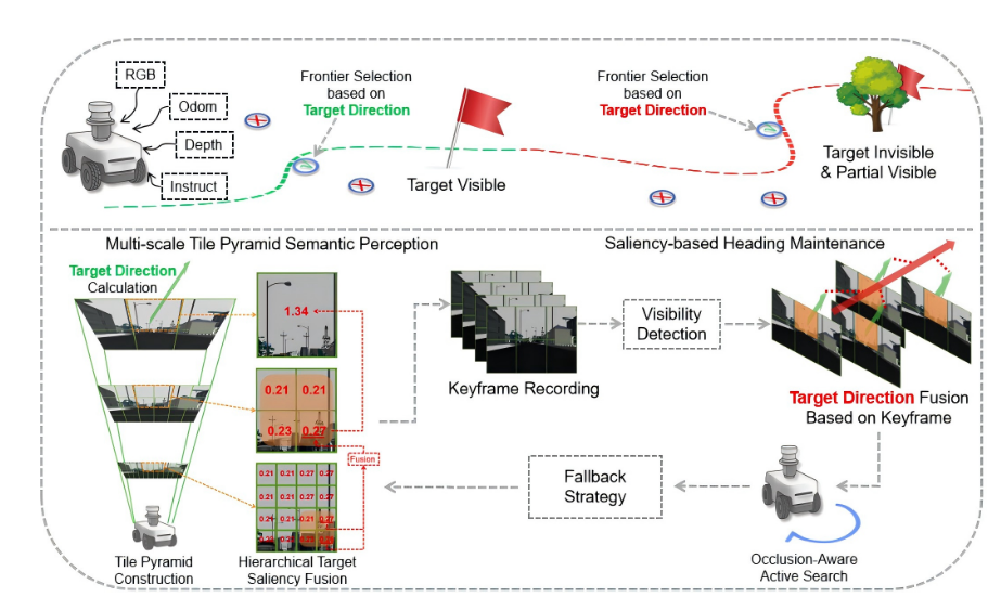 核心含义: 展示了感知模块(左下)如何将处理后的方向信息传递给导航模块(右上),以及导航模块如何在丢失目标时利用关键帧(右中)进行回溯和主动搜索 。