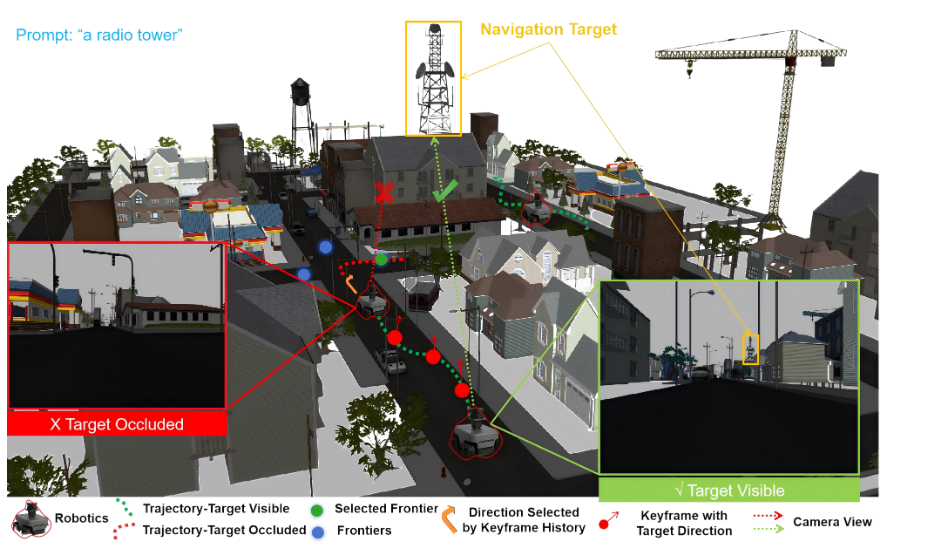 内容描述: 这张图展示了一个机器人在复杂街道寻找“无线电塔 (radio tower)”的场景。