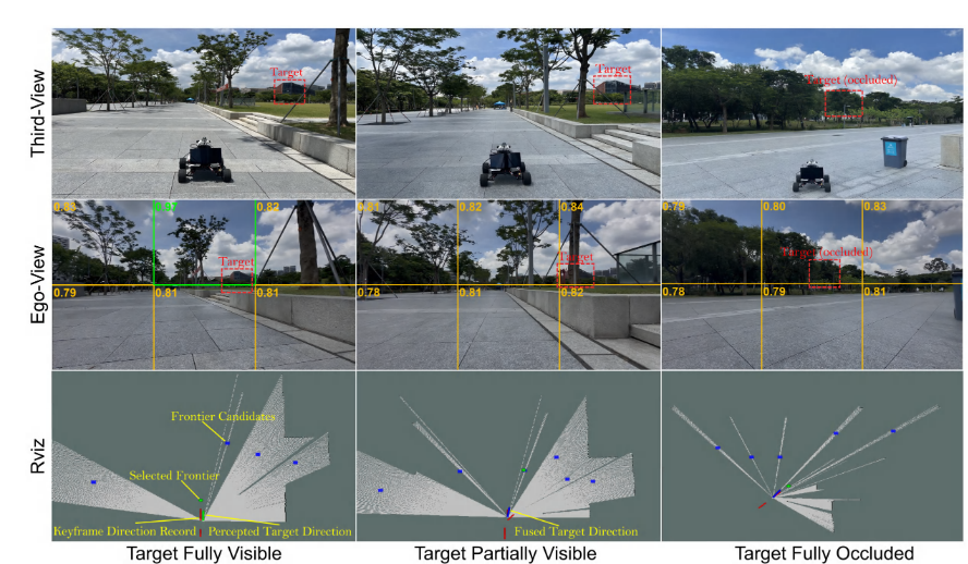中列(部分可见):目标只露出一角,机器人利用红色箭头(记忆方向)辅助。 * 右列(全遮挡):目标完全被树挡住,RViz中显示机器人正在基于蓝色点(融合后的推测方向)继续探索 。