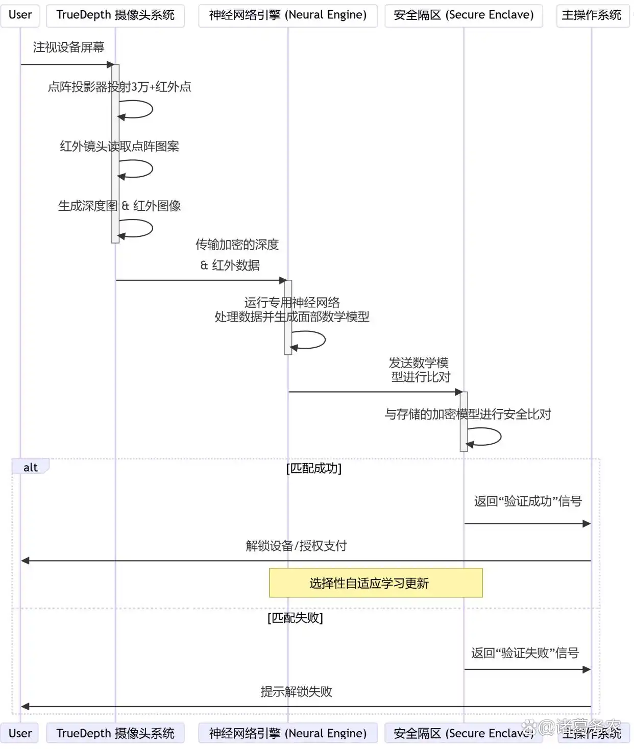 iPhone Face ID 的流畅体验,背后是多个硬件和软件的协同工作,其核心是一个复杂的感知-计算-验证流程: