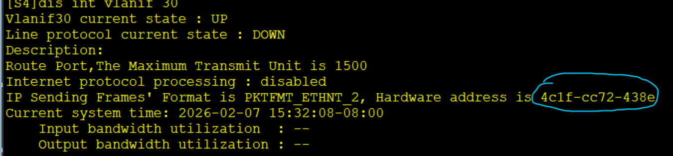 #查看 S4 的 VLANIF30 的接口 MAC 地址