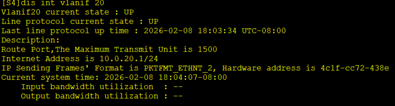 [S4-Vlanif20] ip address 10.0.20.1 24