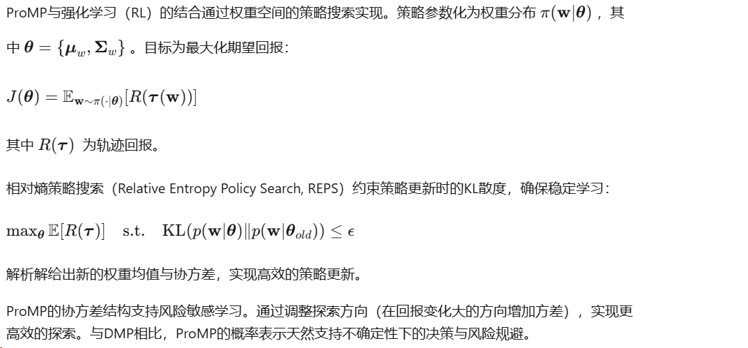 概率运动原语(Probabilistic Movement Primitives, ProMP)是DMP的概率扩展,将确定性轨迹表示为概率分布,支持不确定性量化、风格变化与强化学习。