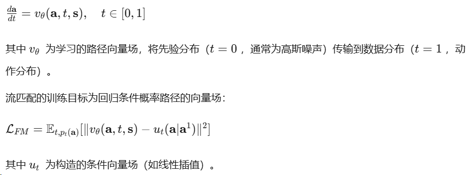 流匹配(Flow Matching, FM)是替代扩散模型的生成方法,直接学习概率路径的向量场,实现更高效的采样。与扩散的随机微分方程(SDE)不同,流匹配使用常微分方程(ODE):