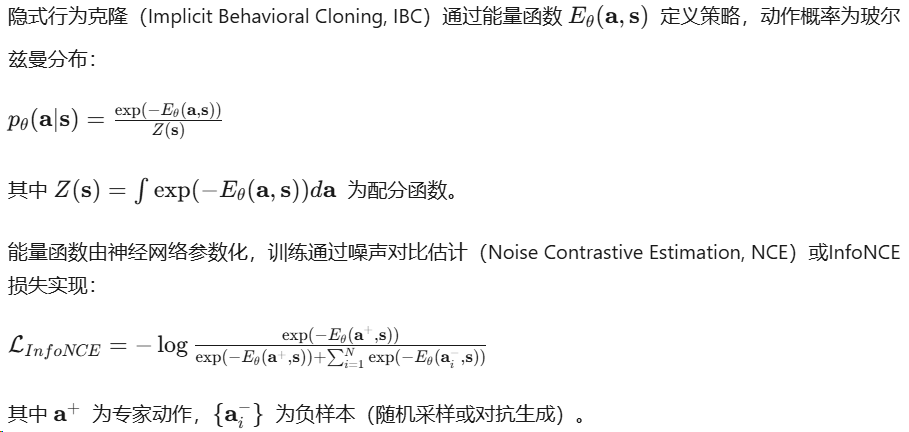 隐式策略表示通过能量函数或评分函数定义策略,而非显式的条件分布。这种表示支持多模态动作分布、组合泛化与高维动作空间的学习。