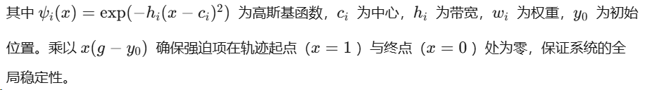 DMP包含两个吸引子机制:形状吸引子(shape attractor)与目标吸引子(goal attractor)。目标吸引子由线性动态系统的收敛特性保证,确保系统最终到达目标位置 g 。形状吸引子通过非线性强迫项编码期望的轨迹形状。