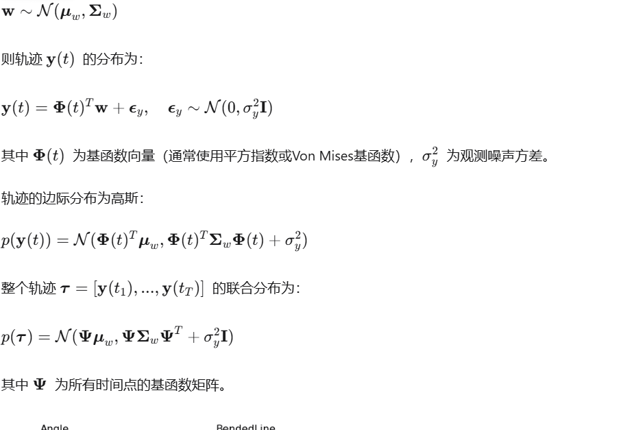ProMP将轨迹建模为时间相关的随机过程,通过权重空间的概率分布诱导轨迹分布。假设权重 w 服从高斯分布: