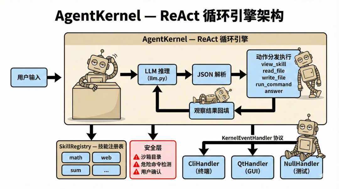 关于本文的范围:为了聚焦核心机制,本文只实现 Agent 最本质的部分——ReAct 推理循环、技能系统、命令执行。至于上下文窗口溢出、对话历史裁剪、Token 优化这些工程细节,它们当然重要,但都是可以解决的已知问题,不是我们研究的重点。我们要搞清楚的是:Agent 的"智能"到底从何而来?那个让 LLM 从"只会说"变成"能做事"的核心机制,究竟是什么?
