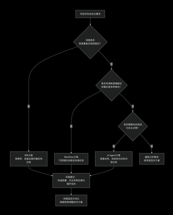 RPA的最佳场景:高频率、低变化性的确定性任务。如数据录入、格式转换、定期报告生成等。当错误成本低、流程稳定、追求快速投资回报时,RPA是最经济高效的选择。