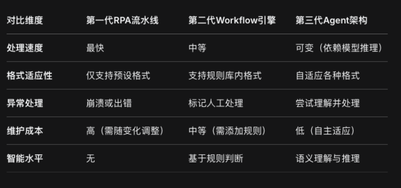 随着技术发展,RPA、Workflow和Agent之间的界限正在模糊,呈现融合趋势:
