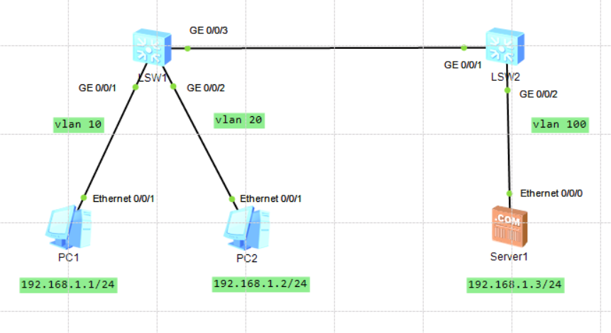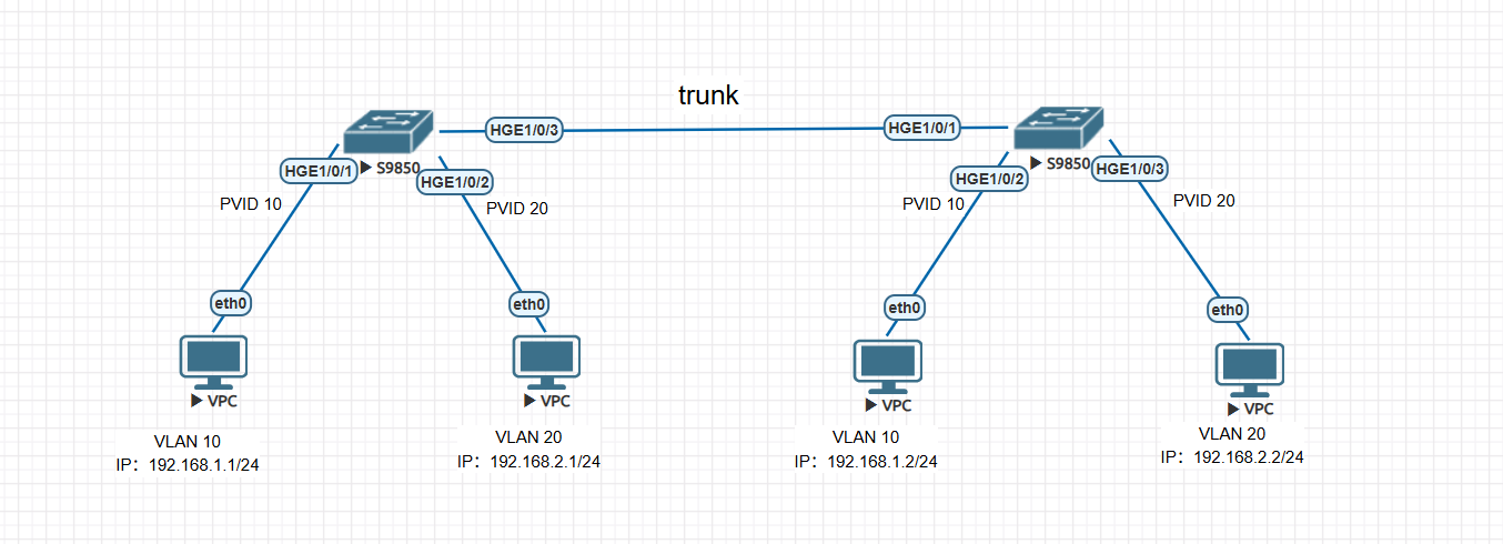 先来介绍一下这个拓扑图,交换机与终端相连使用的是access接口模式;两个交换机相连使用的是trunk模式;