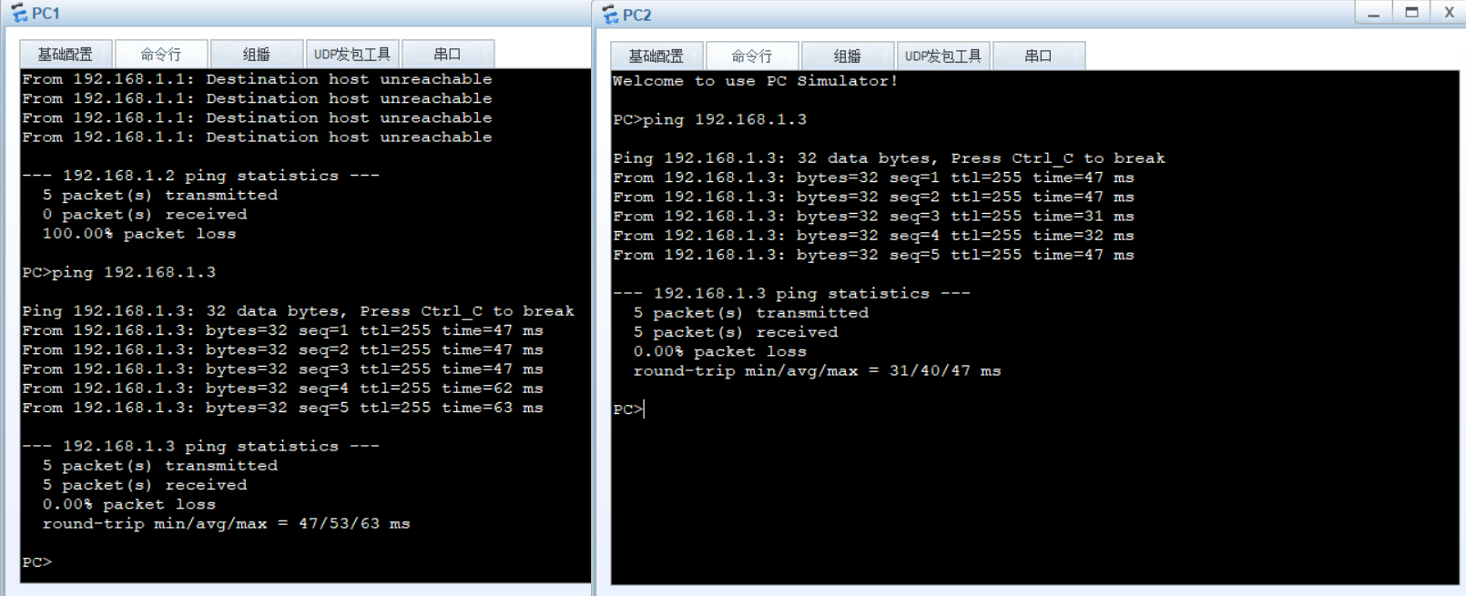 正如图上所标记的那样,四个pc有四个ip两个网段,接下来的配置就是要吧相同网段的两个PC能够通信就可以。这里没有给PC配置网关,是因为我们使用的是二层通信;如果配置了网关就需要进行三层通信需要用到VLANIF技术。
