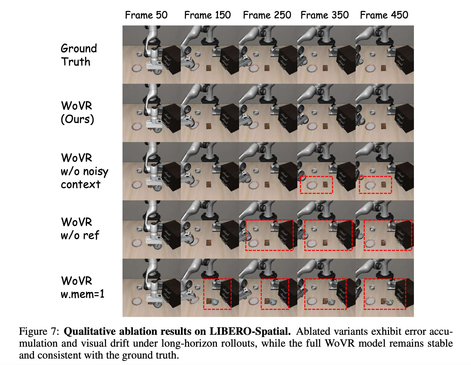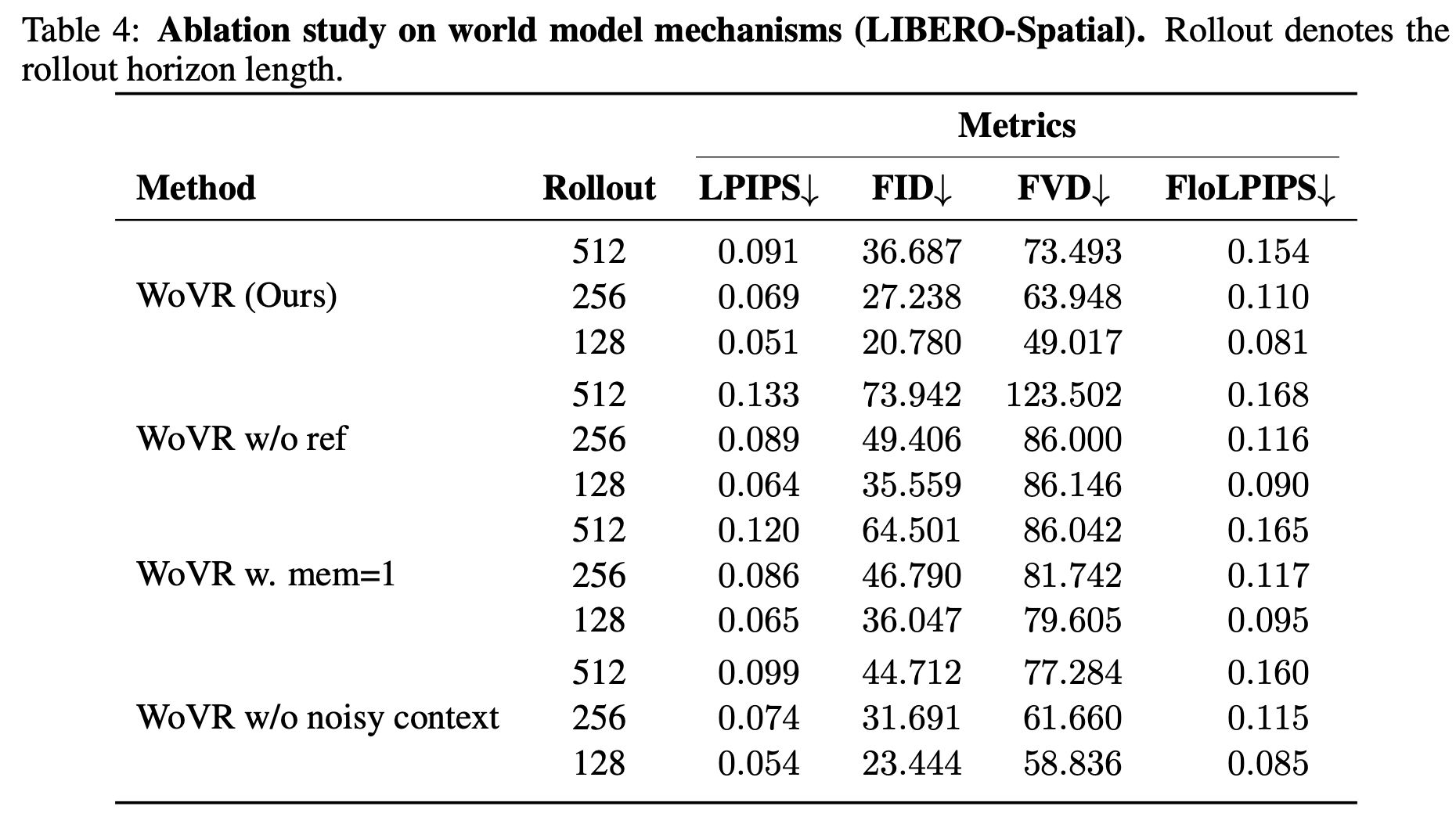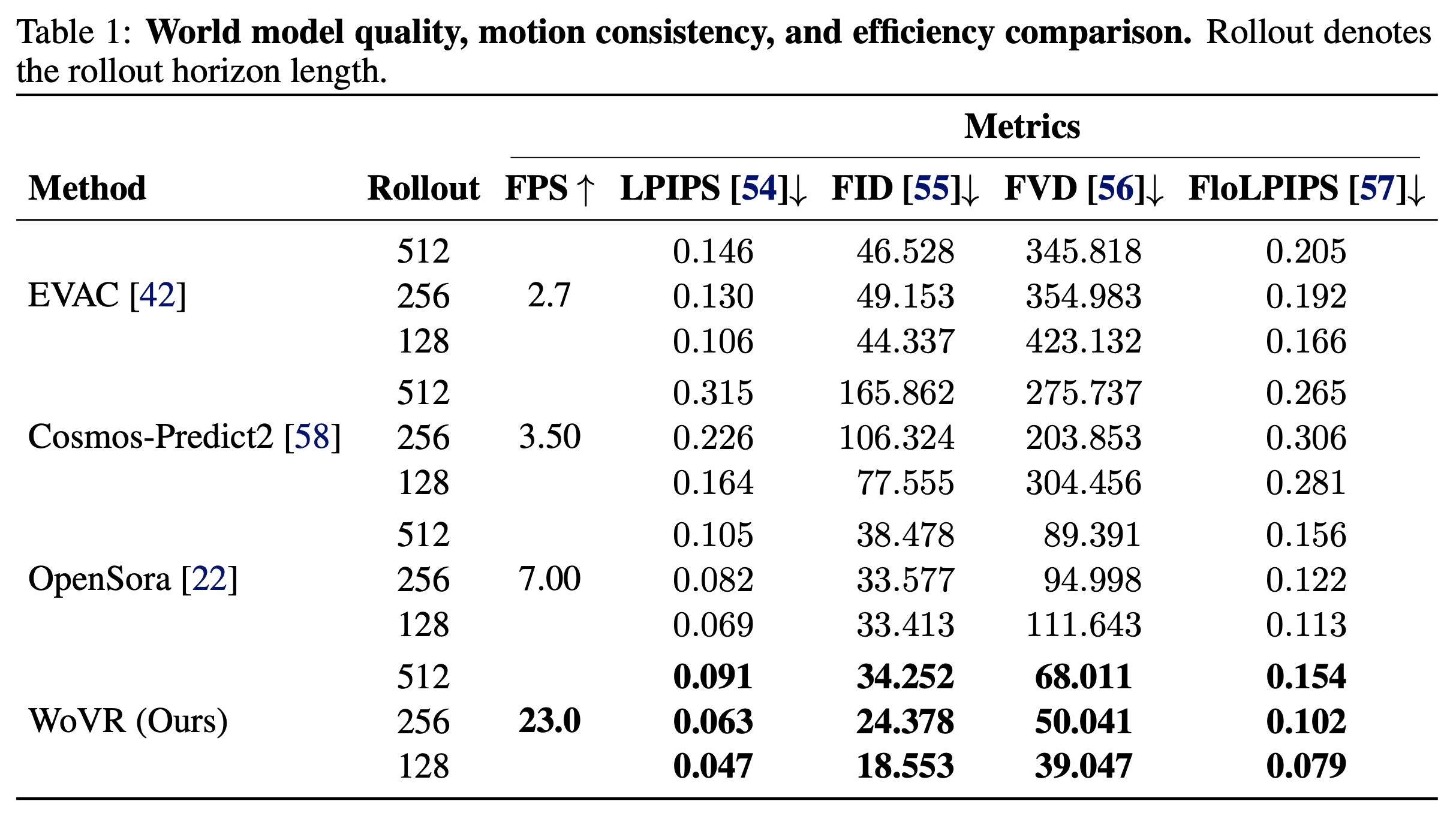 WoVR在rollout 128/256/512帧的情形下性能超过EVAC,Cosmos-Predict2和WMPO中所采用的OpenSora。