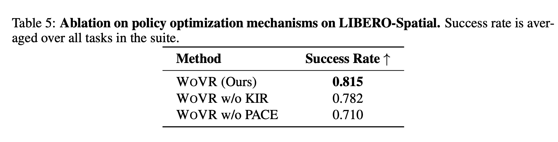 这里还验证了KIR(关键帧初始化)机制和PACE(世界模型和策略协同进化)机制对于策略性能的提升效果。