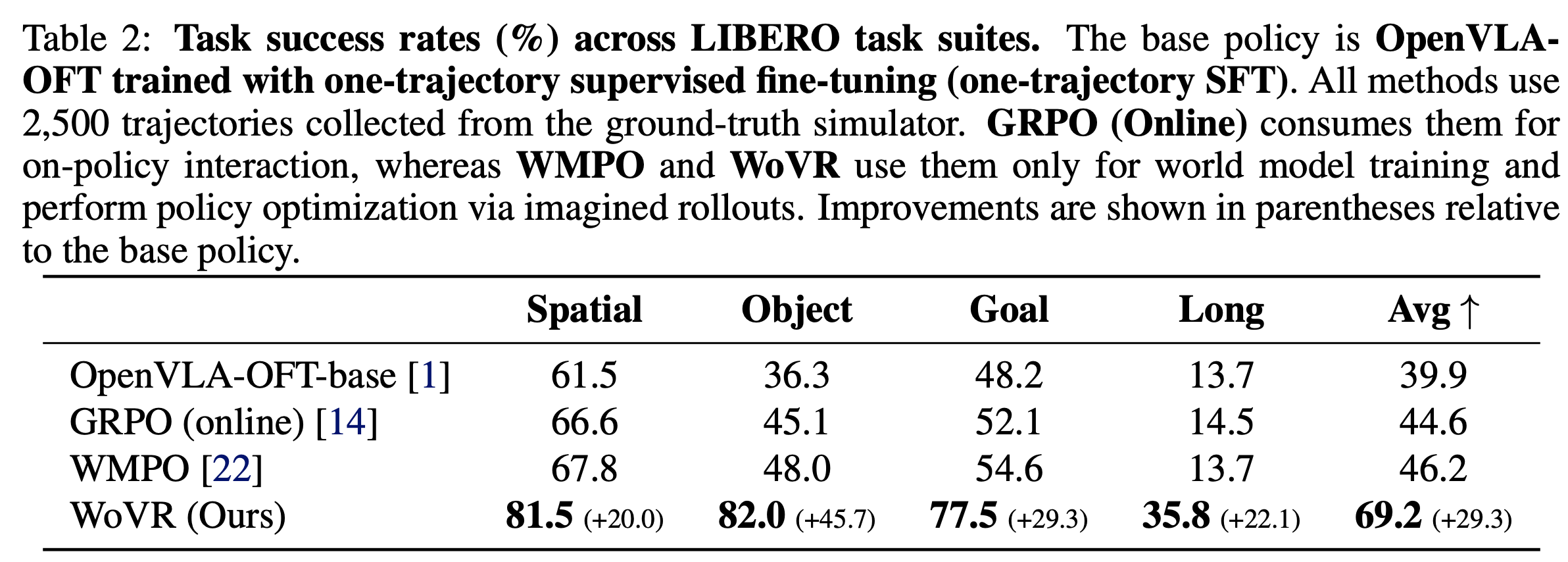 在 libero suite 上进行实验,每类套件上,我们限制世界模型和仿真器的交互轨迹数量,以此来模拟真实世界中轨迹昂贵的情况。 WoVR 和 WMPO 作为基于世界模型的方法,使用的轨迹都只用来训练世界模型,再在世界模型中训练策略,而 GRPO 则是通过和环境进行交互来优化性能。在相同的轨迹条数限制下,WoVR在4个套件上均实现超过WMPO和GRPO。