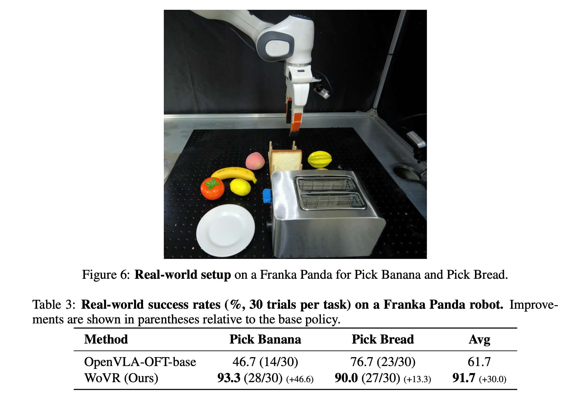真机上,基于 Franka 开展了两个经典的 pick and place 的任务,在引入少量轨迹,无需在线交互只在世界模型中训练策略的情况下, WoVR实现了策略性能提升。