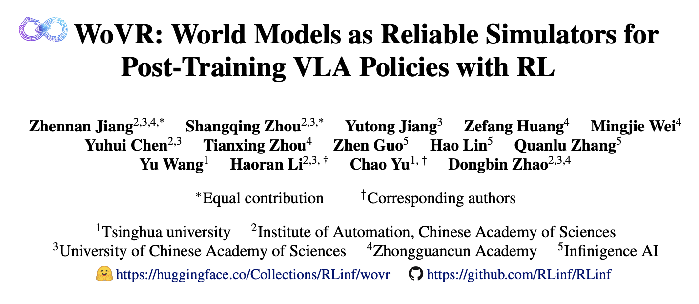 清华大学、中国科学院自动化研究所和北京中关村学院联合提出 WoVR(World Models as Reliable Simulators for Post-Training VLA Policies with RL):一种基于可靠世界模型的VLA 强化学习后训练框架,核心聚焦一个痛点:世界模型的闭环自回归执行会产生“幻觉”,如何让强化学习在着这种不完美的世界中实现有效训练?