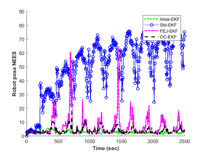 估计方差对比:OC - EKF 的估计方差相对较小,表明它能够更合理地估计状态的不确定性,为机器人的决策提供更可靠的信息。Standard EKF 和 FEJ - EKF 的估计方差较大,反映出它们在处理不确定性方面的不足,可能导致估计结果的可靠性降低。