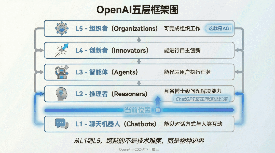 前三层,我们已经看到了。ChatGPT是第一层,能推理的AI是第二层,Agent是第三层。但第四层和第五层,还没有到来。