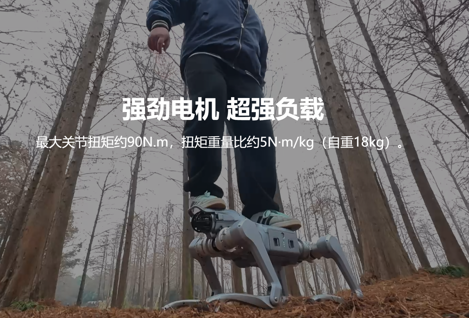 第一,As2最核心的技术优势在于其极高的“扭矩重量比”。它仅凭18kg的自重,就实现了90N·m的峰值扭矩和5m/s的极速,动力是消费级旗舰Go2的两倍 。这意味着它既有消费级产品的轻便灵活,又具备了行业级应用所需的高爆发力和运动能力:90N·m的关节扭矩为其攀爬(50cm高台)、跳跃等复杂动作提供了坚实基础 。5m/s的速度让它能轻松跟随全速奔跑的人类或移动的车辆,大大拓展了在动态场景下的应用范围。