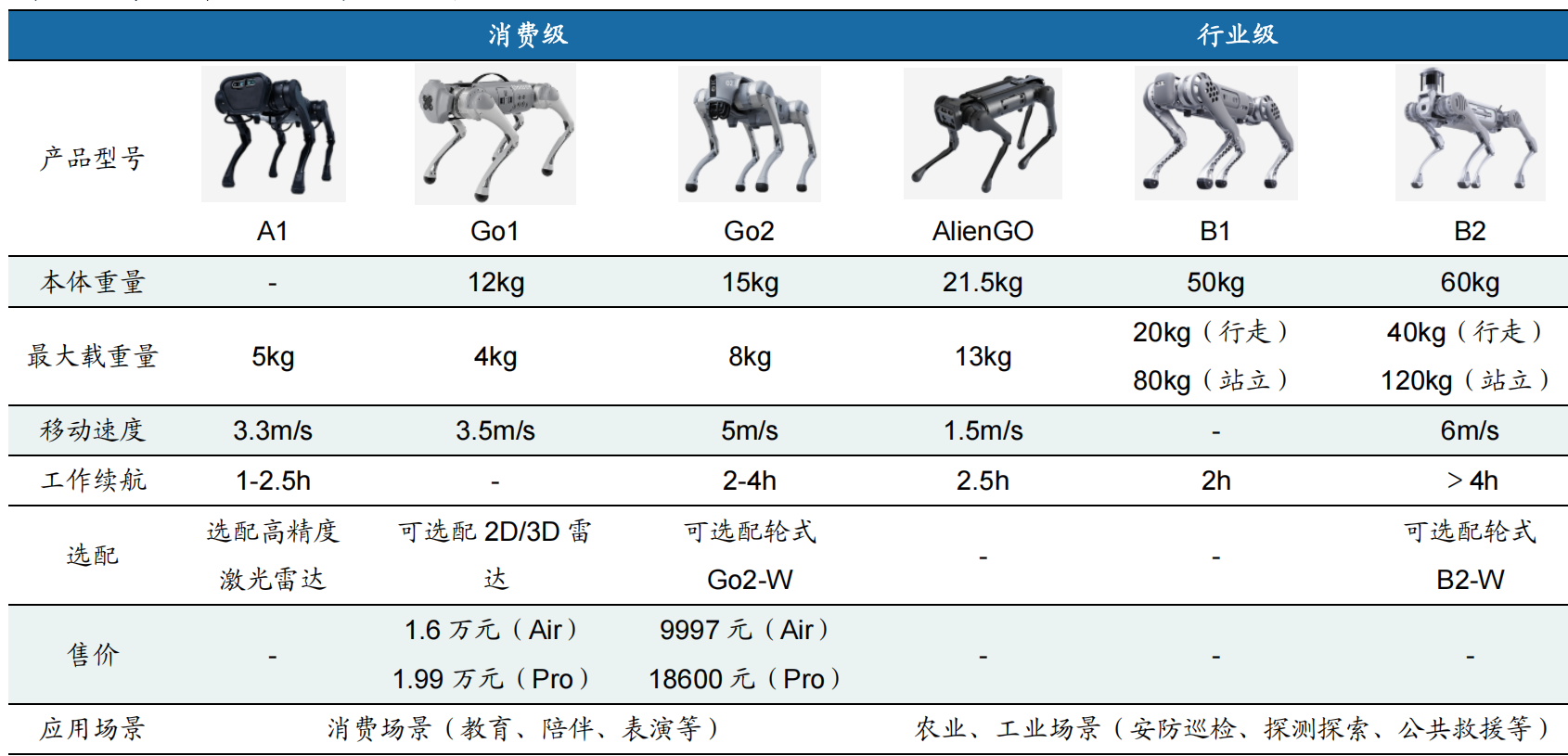此前,宇树科技2025年8月发布了行业级四足机器人Unitree A2,2023年11月其发布了工业级四足机器人Unitree B2,均为超40kg的较重型产品。2023年7月12日推出的消费级仿生四足机器人Unitree Go2。
