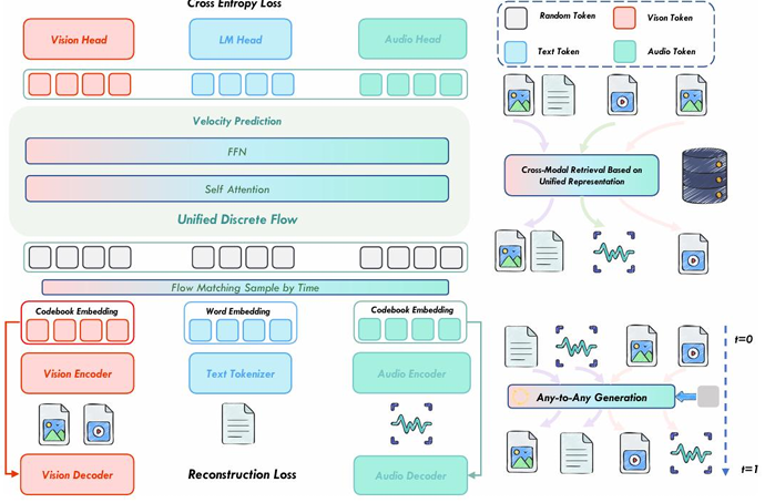 它将所有模态(文本、图像、音频、视频)都统一为离散的Token序列然后直接学习这些离散Token分布之间的变换流场。这使得模型能够实现“任意模态到任意模态”的生成例如文生图、图生文、文生视频、视频生音频等都在一个统一的流模型框架下得以实现。NExT-OMNI的成功标志着流模型在处理离散数据和实现全模态统一生成方面的巨大潜力。