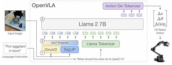 OpenVLA的架构设计精巧而高效。它创新性地采用了双视觉编码器设计,融合了DINOv2和SigLIP两个强大的预训练视觉模型的特征。DINOv2擅长提供低层次的空间几何信息,而SigLIP则能提供高层次的语义信息。这种“双剑合璧”的设计,显著增强了模型对复杂场景的视觉泛化能力,这对于机器人需要在多变环境中进行精确操作至关重要。视觉特征通过一个小型MLP投影器映射到语言嵌入空间,并与基于Llama 2 7B的大语言模型骨干相结合。整个模型通过端到端的方式进行训练,直接将视觉-语言模型微调用于生成机器人的控制动作。