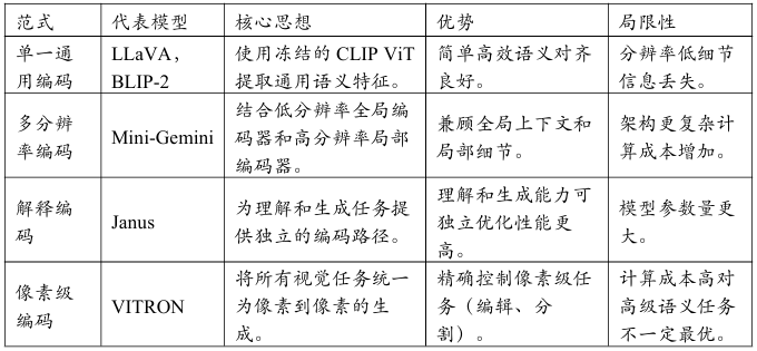 LLM是多模态模型的“大脑”视觉编码器(Visual Encoder)是其“眼睛”。视觉编码器的核心任务是将输入的图像或视频帧转换为一系列LLM能够理解的特征向量。其设计的优劣直接决定了模型能够从视觉世界中汲取信息的深度和广度。其演进过程反映了研究界对于如何提取更丰富、更灵活、更适应下游任务的视觉表示的持续探索大致经历了从“单一通用特征”到“多分辨率协同”再到“任务导向解耦”的演进路径。
