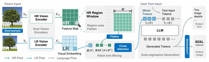 它在保留原有低分辨率CLIP ViT的同时额外增加了一个处理高分辨率图像块的编码器。在处理图像时模型首先用低分辨率编码器获取全局上下文信息然后可以根据需要将图像中的特定区域(或整个图像)以更高的分辨率输入给第二个编码器以获取局部细节。这种“全局概览+局部详查”的机制在不显著增加整体计算成本的前提下有效地提升了模型处理高分辨率细节的能力。