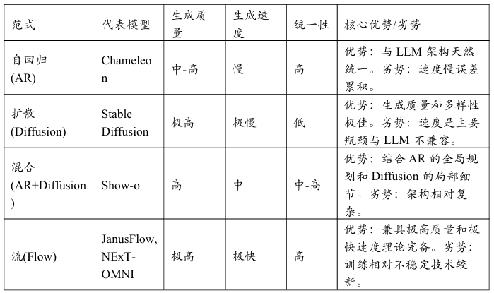 理解是智能的输入生成就是智能的输出。多模态大语言模型不仅要“看懂”世界更要“创造”世界。生成范式的演进是2024年至2025年多模态技术发展最为活跃、最具突破性的领域之一。这场革命的核心是在追求更高生成质量的同时不断提升生成速度并最终将不同的生成模型统一到一个优雅的框架之下。其演进路径主要围绕着自回归(AR)、扩散(Diffusion)和流(Flow)这三大主流范式展开并最终走向了高效的混合生成。