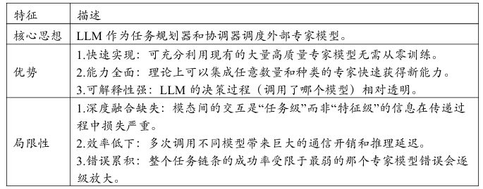 尽管存在明显局限外部专家集成范式在当时起到了重要的承上启下的作用。它首次展示了将LLM的通用推理能力应用于复杂多模态任务的巨大潜力为后续更深度的融合建模提供了宝贵的思路启示。然而其固有的浅层交互模式决定了它只能是一种过渡方案。