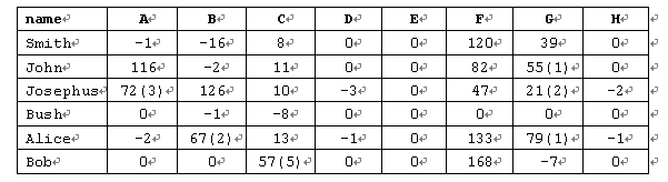 例如:某次考试一共8题(A,B,C,D,E,F,G,H),每个人做的题都在对应的题号下有个数量标记,负数表示该学生在该题上有过的错误提交次数,但到现在还没有AC,正数表示AC所耗的时间,如果正数a跟上一对括号,里面有个整数b,那就表示该学生提交该题AC了,耗去了时间a,同时,曾经错误提交了b次(如果b为0则没有括号及b),因此对于下述输入数据: