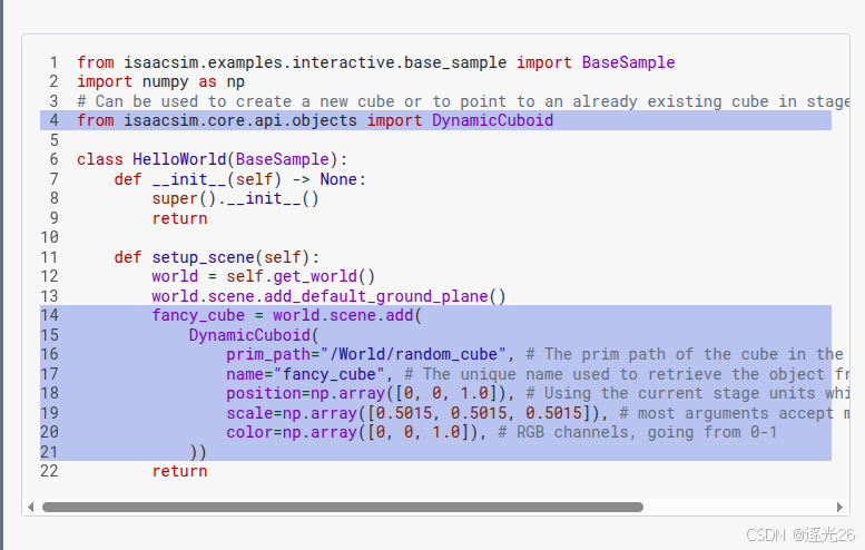 该代码在hello_world.py中,可以在终端打印出方块的世界位姿(位置和朝向)以及速度,检查小方块初始位置正确。